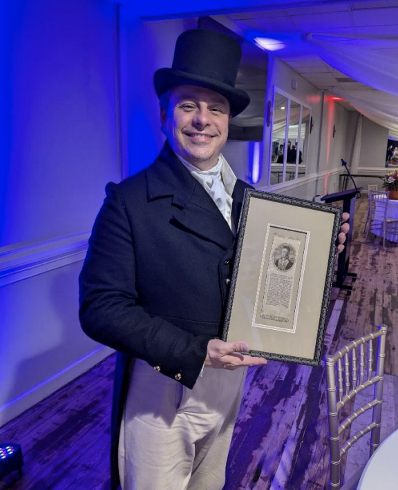 Lafayette (Charles Wissinger) holding an antique ribbon
