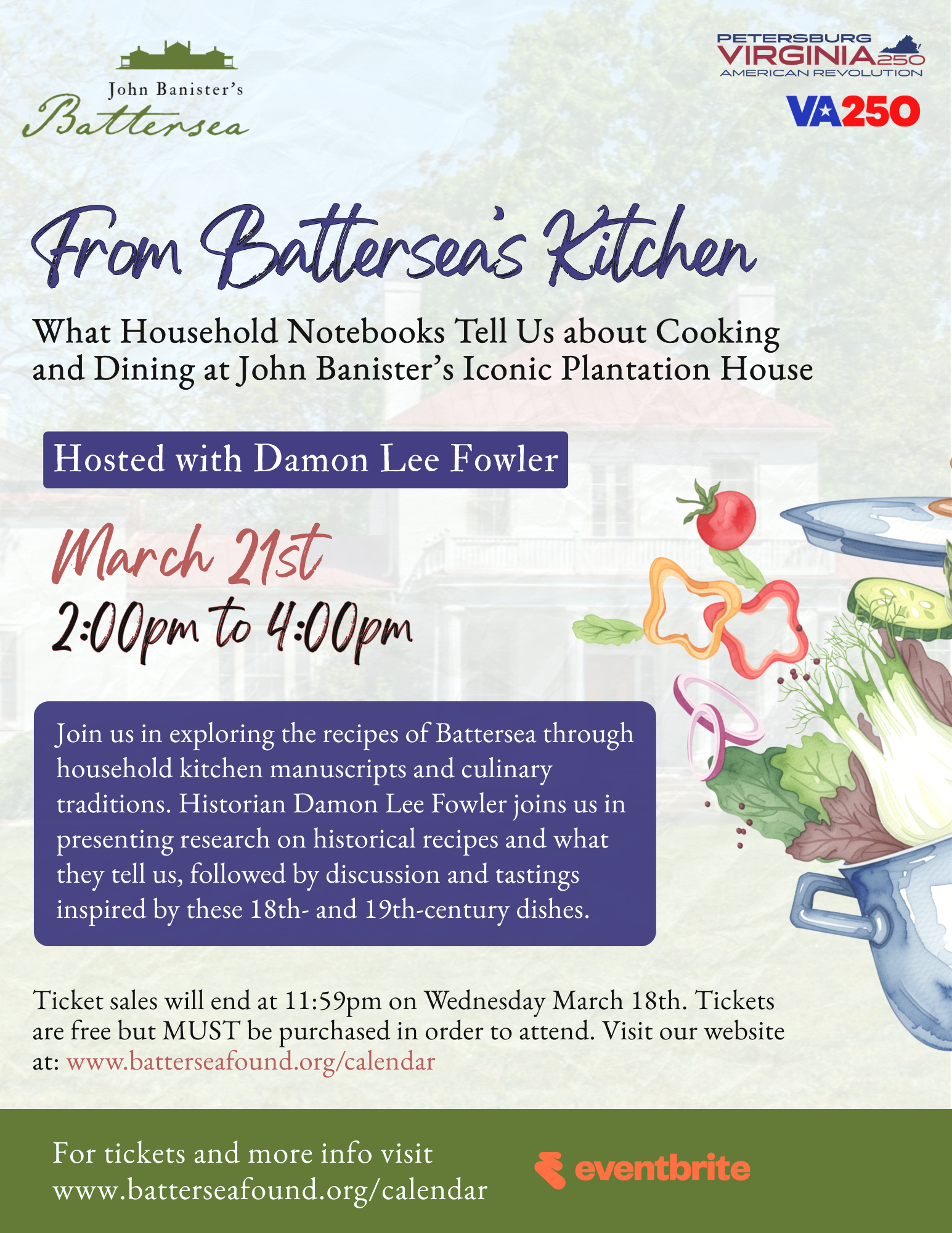 This special program is part of our VA250 celebrations, and will bring research to life through a culinary history event. The first half will feature a talk by author, Damon Lee Fowler, exploring 18th century culinary traditions at homes like Battersea, drawing directly from original recipes that were once stored in the kitchen building. Guests will learn about historic cooking practices and translated recipes that reveal how food was planned, prepared, and presented. Following the lecture, attendees will enjoy tastings inspired by these historic recipes with the opportunity for discussion and Q&A.